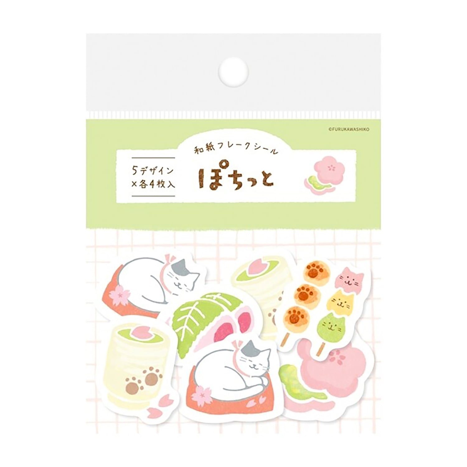 古川紙工 - 和紙貼紙包 (淺綠色黑白貓和菓子款)
