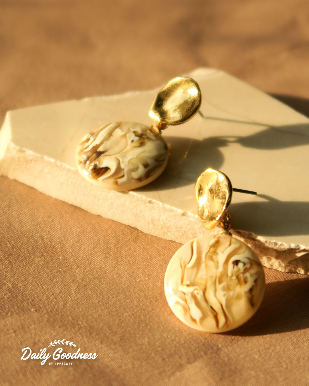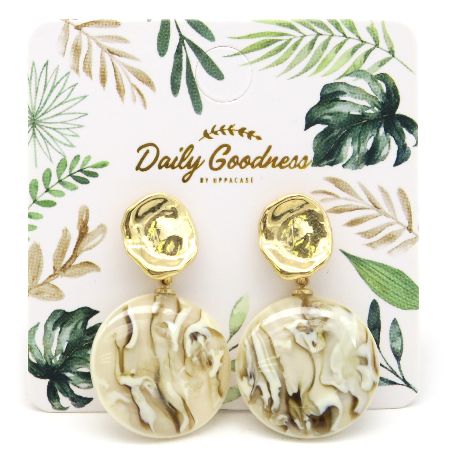 AM - 壓紋金屬圓形雲石耳環 (米白色款)