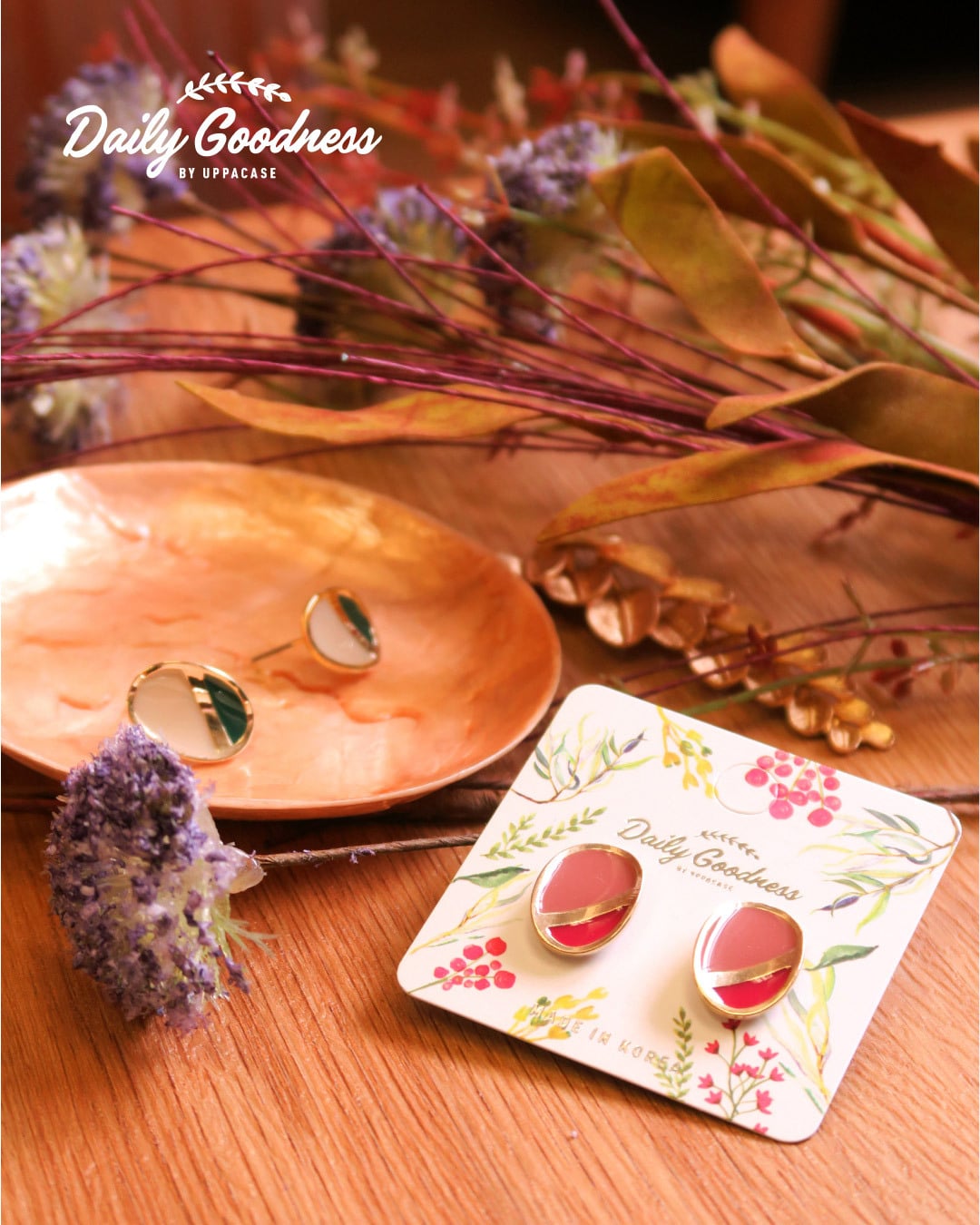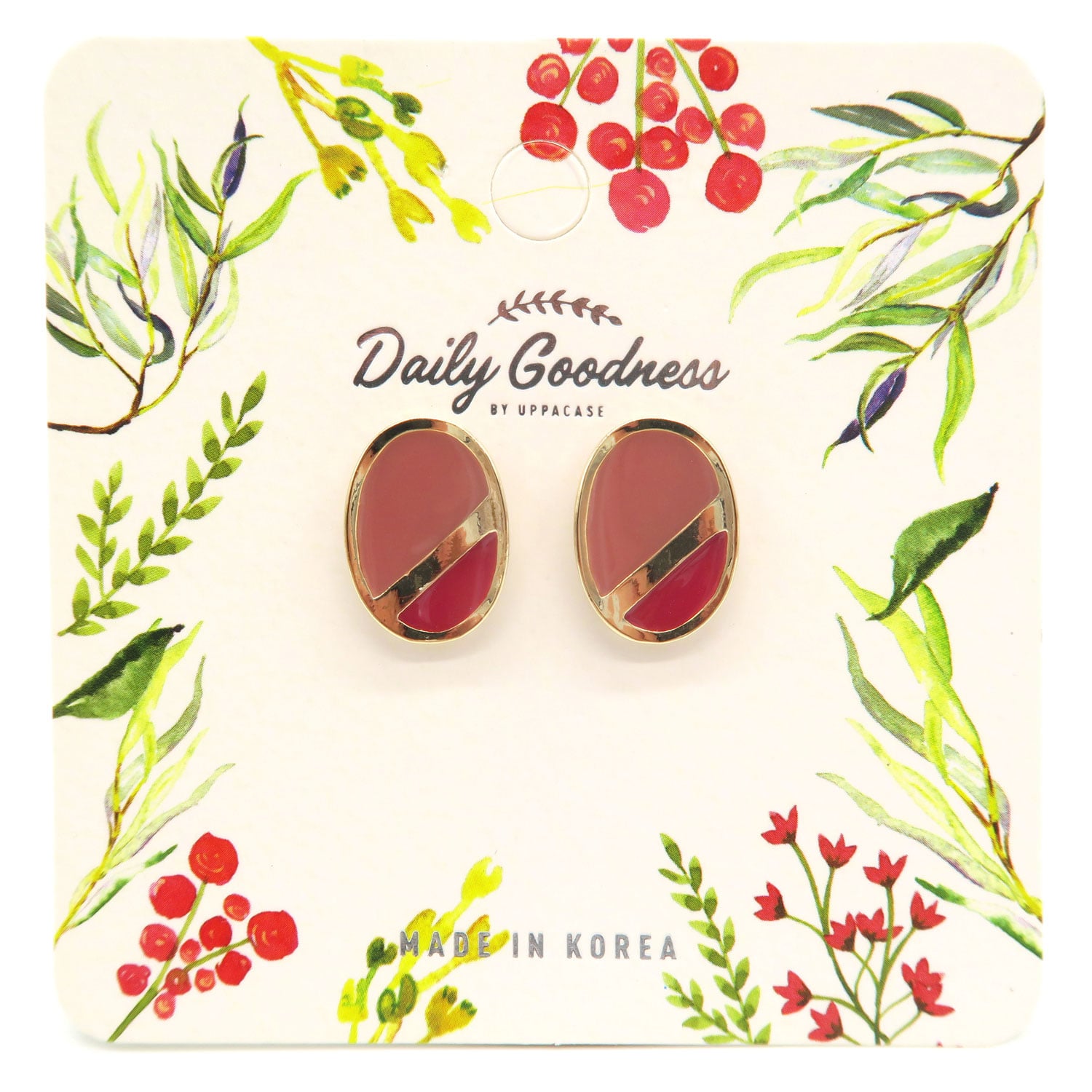 BY - 金屬拼色橢圓耳環 (煙粉色拼酒紅款)