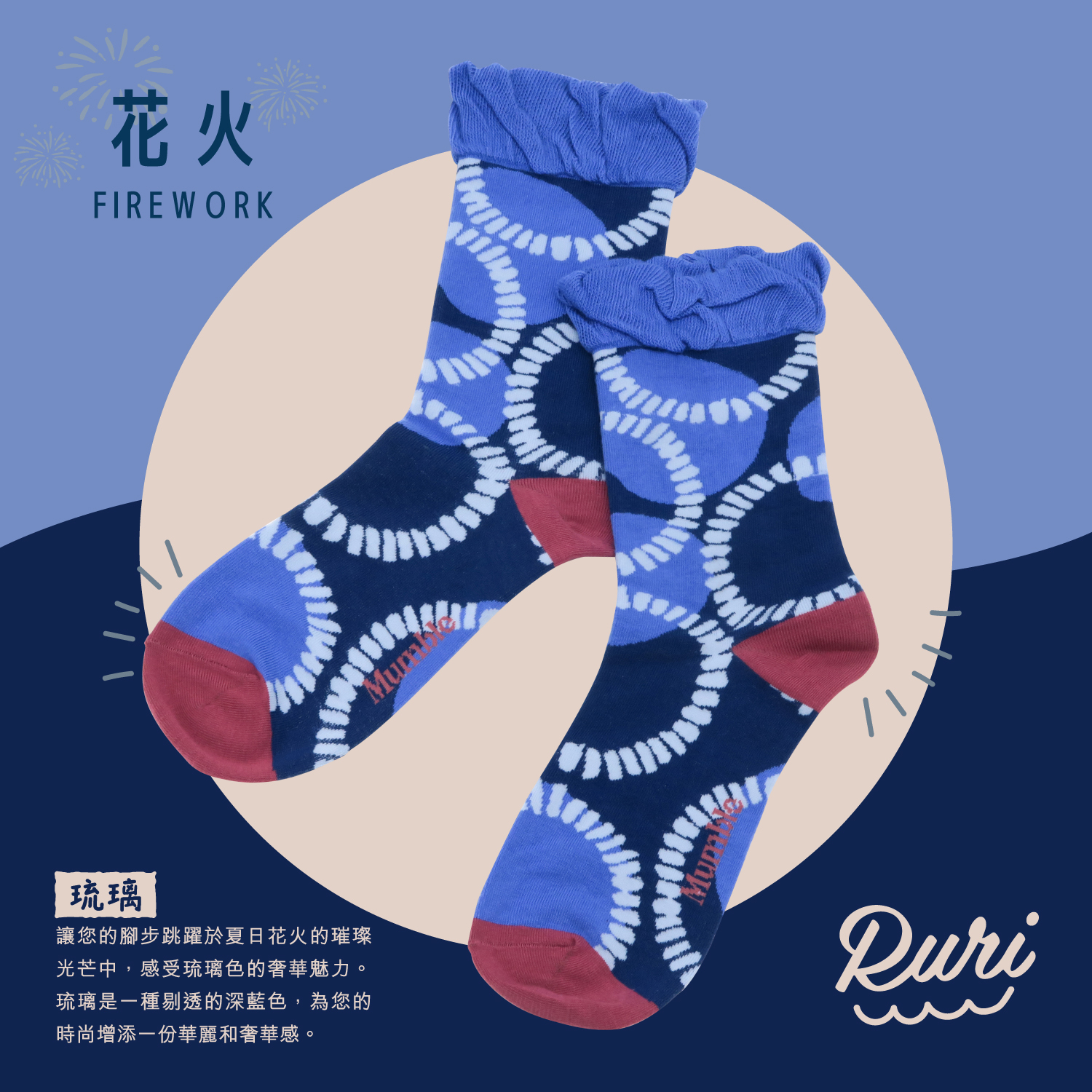 讓您的腳步跳躍於夏日花火的璀璨光芒中,感受琉璃色的奢華魅力。琉璃是一種剔透的深藍色,這個設計概念將夏祭花火和琉璃色的珍貴美感完美結合。每一步,都彷彿融入了夏日花火的奔放和琉璃的璀璨。這款襪子以豔麗的琉璃色調和精緻的花火圖案,為您的時尚增添一份華麗和奢華感。女裝尺寸:23-25cm