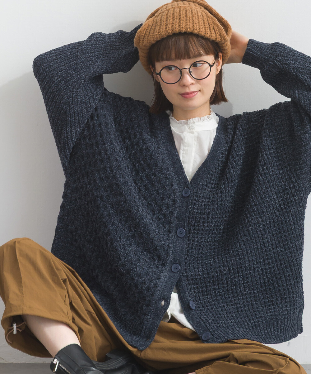 LP - 粗幼拼接冷織開襟毛衣 (深藍色)