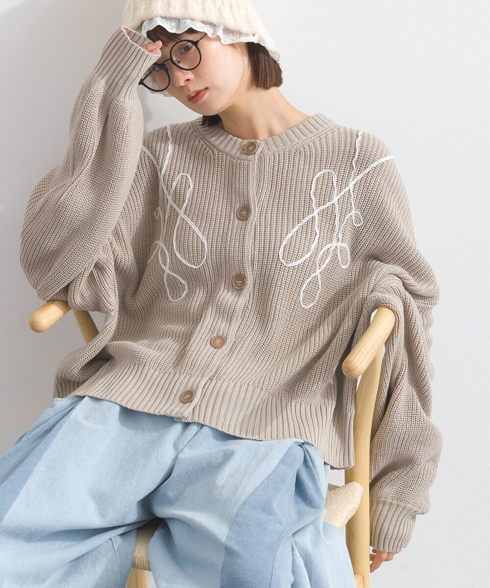LP - 絲帶織紋開襟毛衣 (杏色)