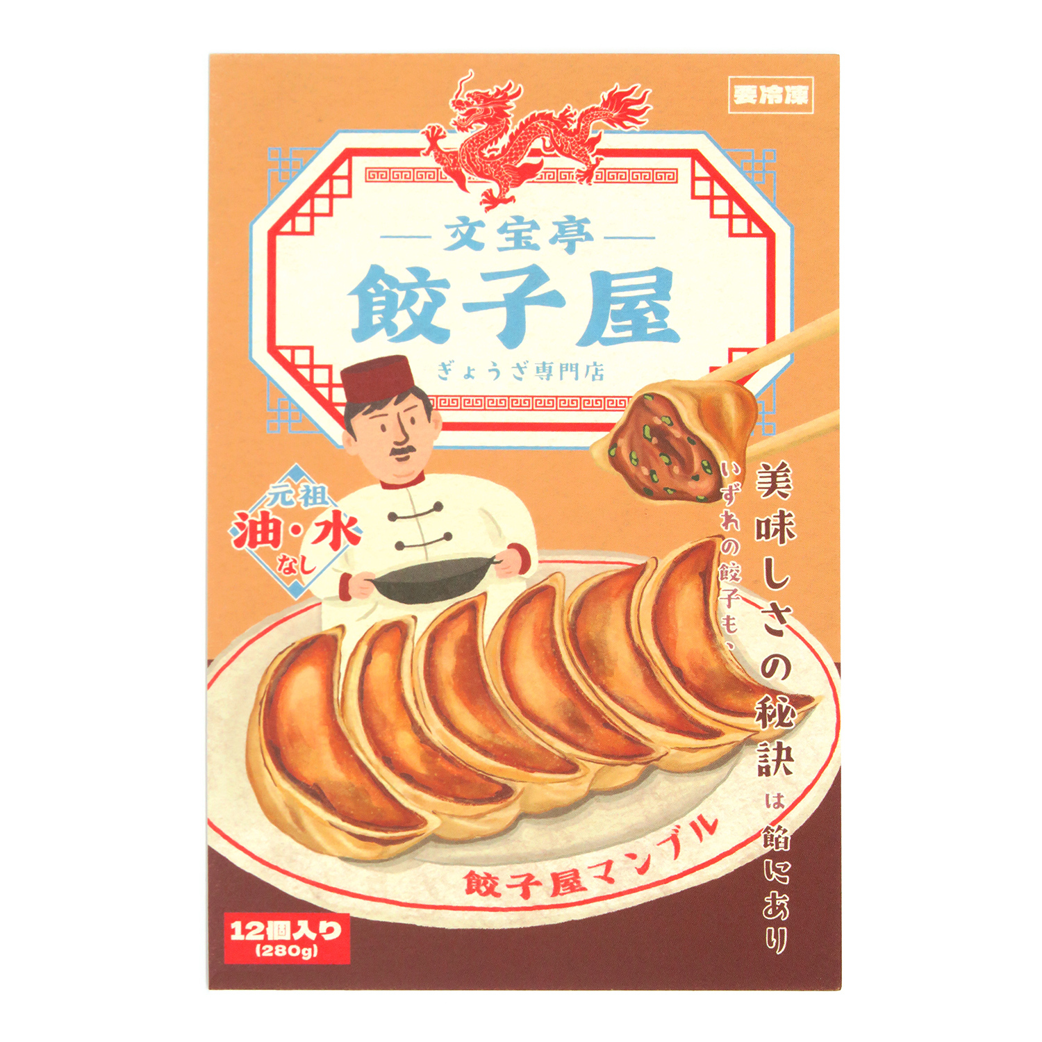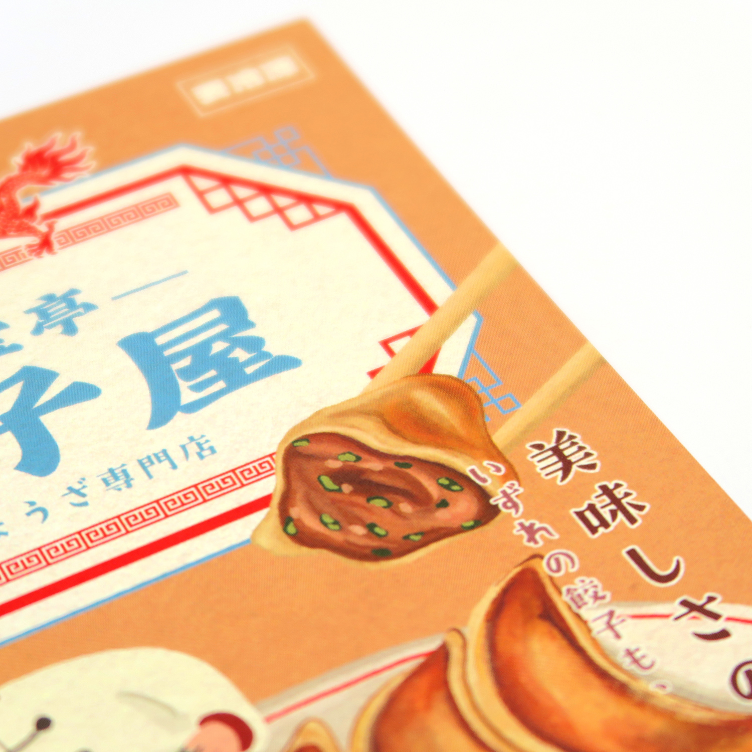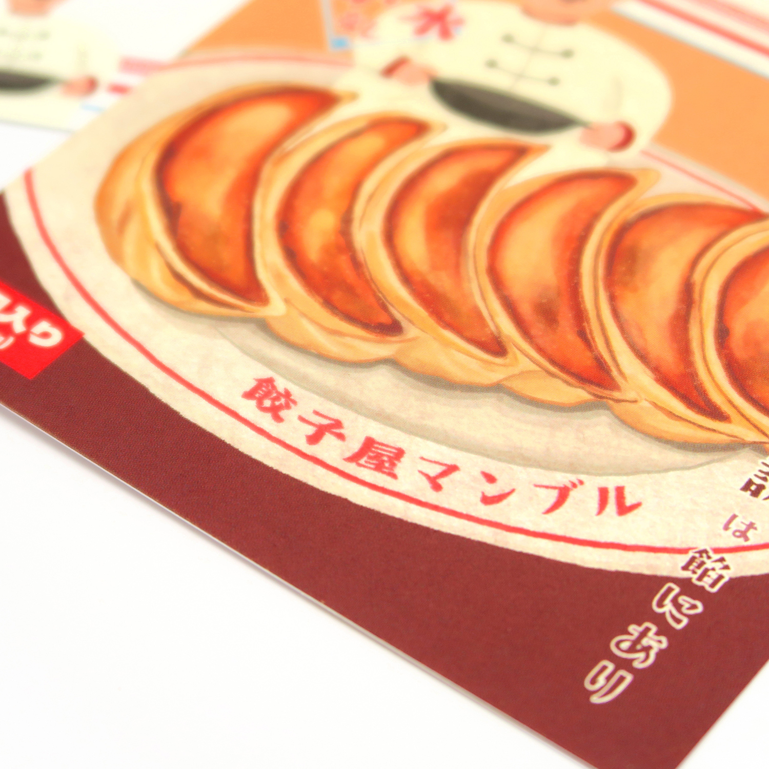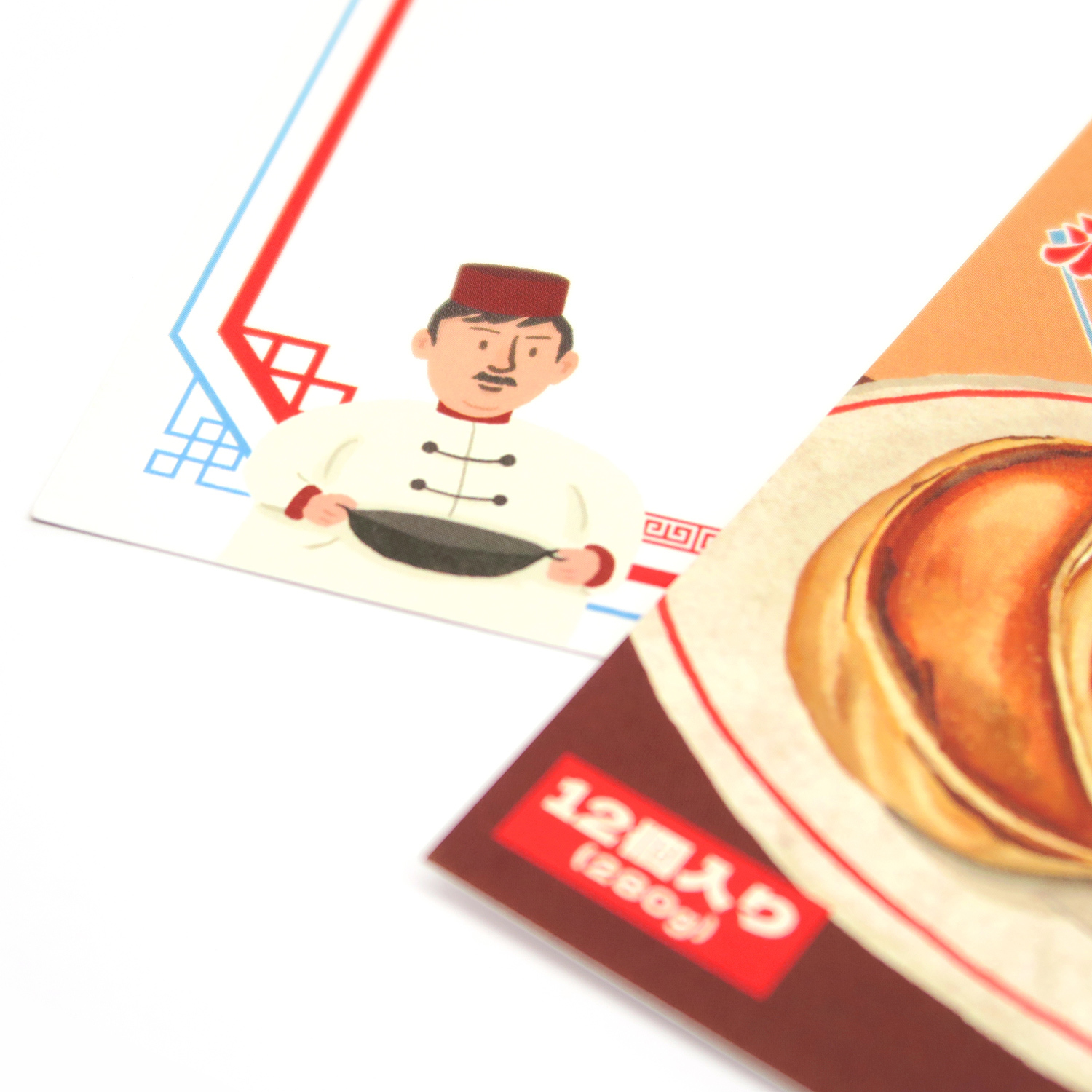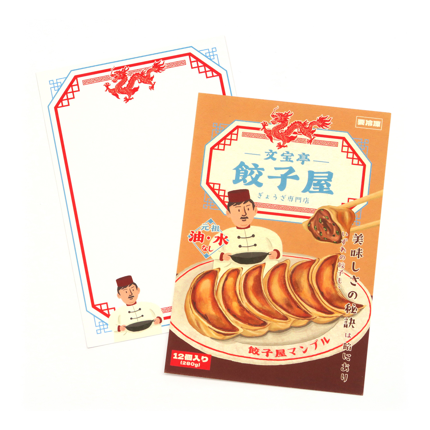 明信片上的插圖模仿了冷凍餃子的包裝設計,展示了香脆的餃子和充沛的肉汁,勾起人們對美食的食慾。
