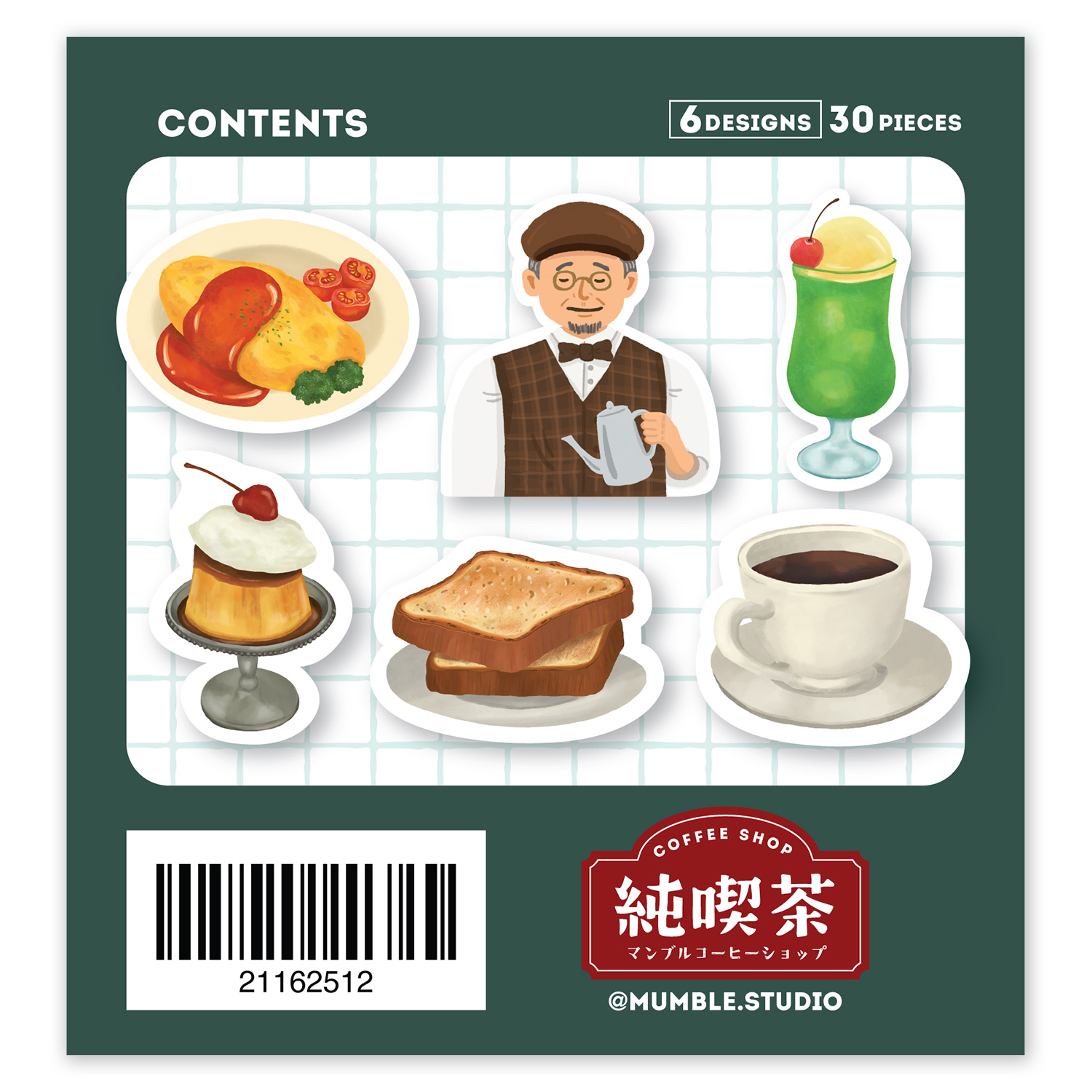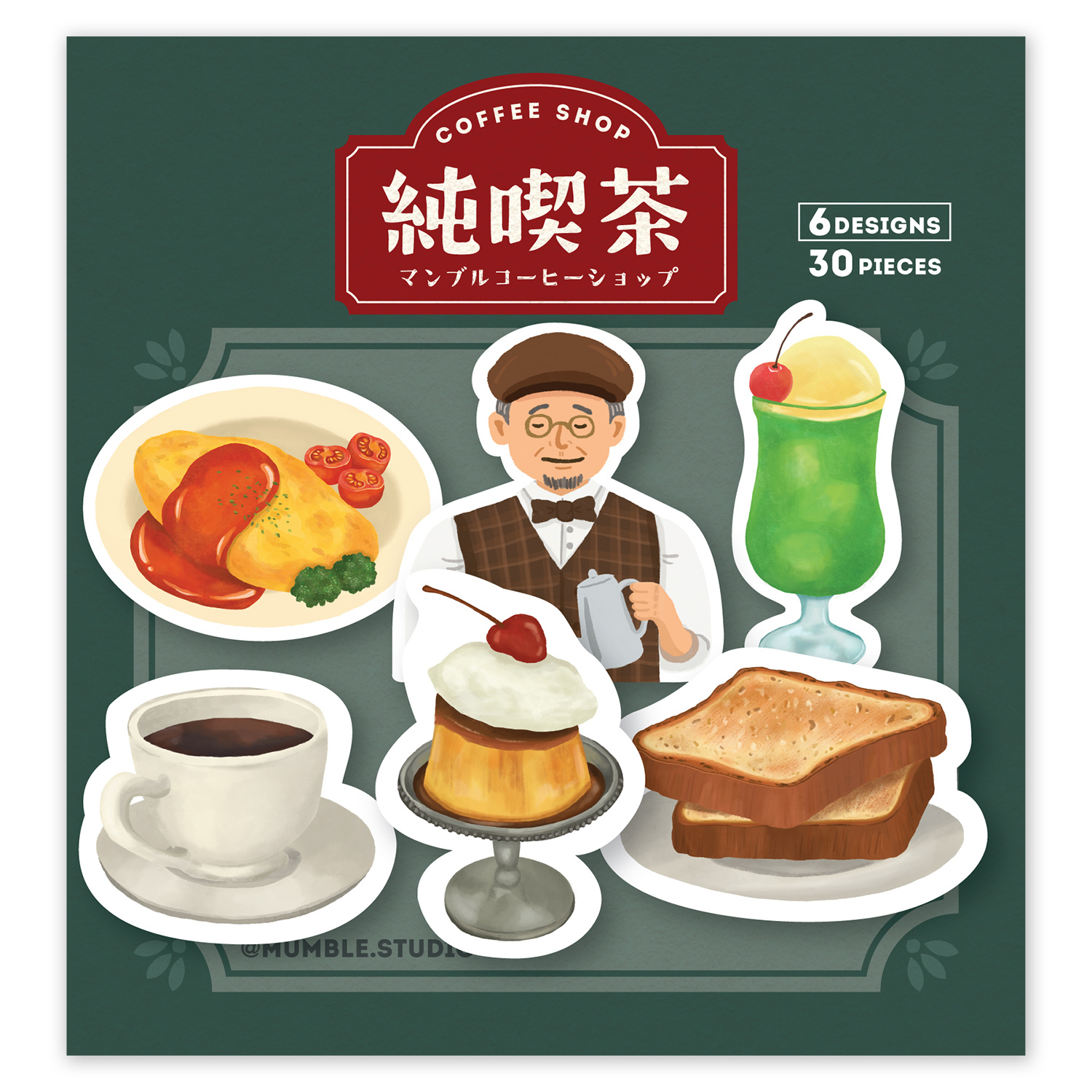 「日式蛋包飯」主題貼紙包呈現了日式洋食店的溫馨氛圍,包括親切的咖啡店老闆、金黃誘人的蛋包飯、香脆的吐司、滑嫩的雞蛋布丁,以及香濃的咖啡。