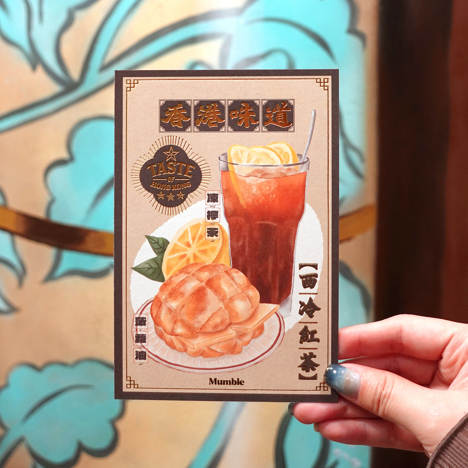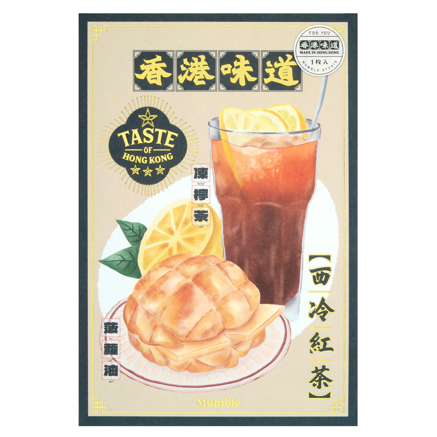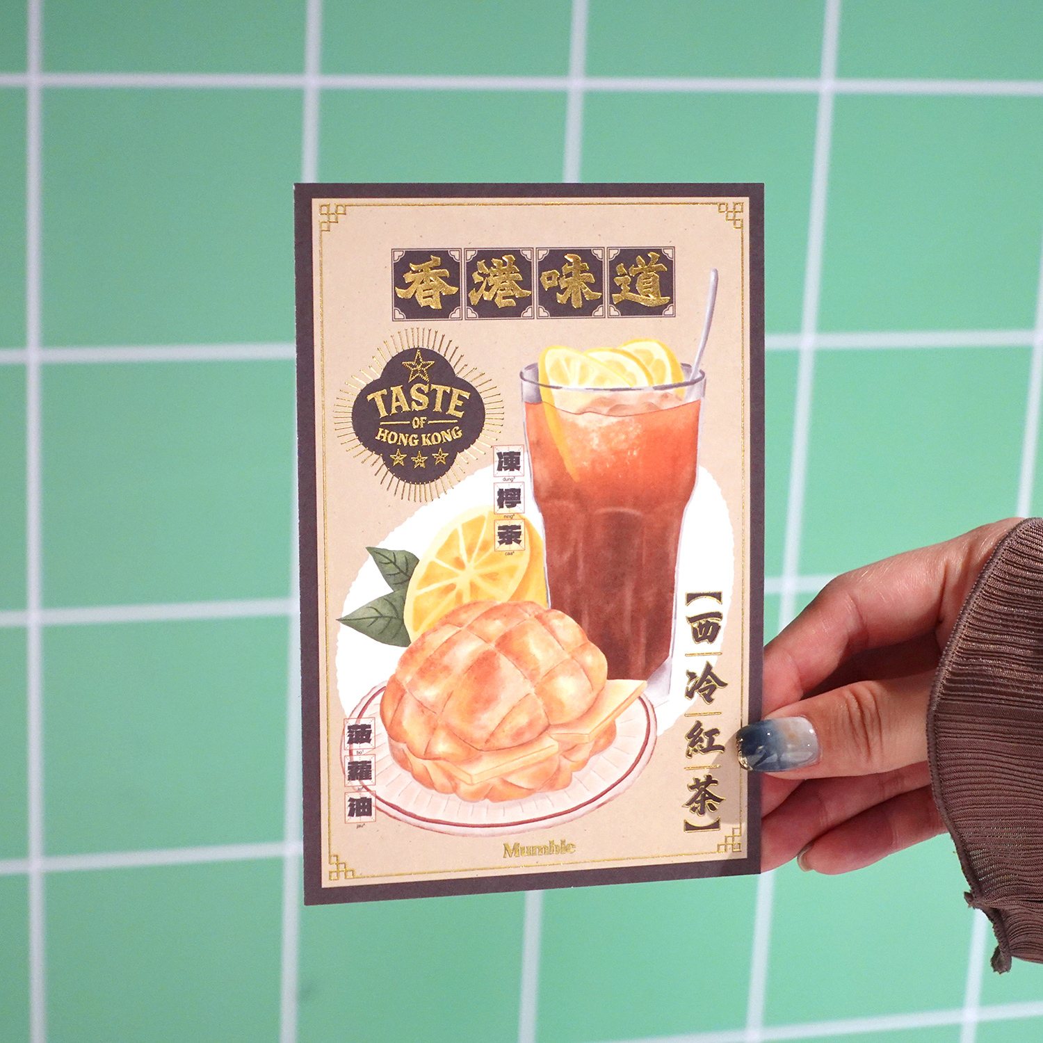 Mumble原創設計香港味道系列明信片,帶你品味地道的香港美食文化。明信片展示了一杯清涼的凍檸茶和一個香氣四溢的菠蘿油,這對香港早餐的經典組合。這些明信片特別採用燙金印刷及厚實的紙張增加質感,將香港的獨特美食帶到你的手中,讓你能夠分享香港的味道和文化。不論是作為紀念品,送禮或自己珍藏,這些明信片都是展現香港獨特風味的完美選擇。商品尺寸:約14.8×10cm