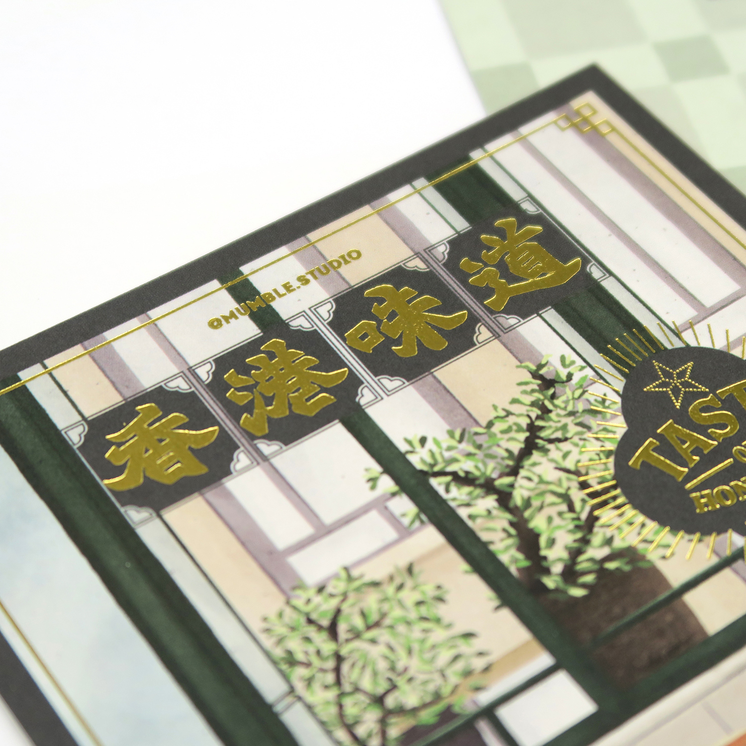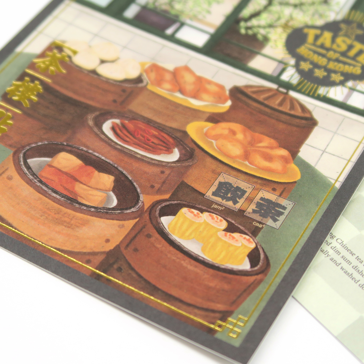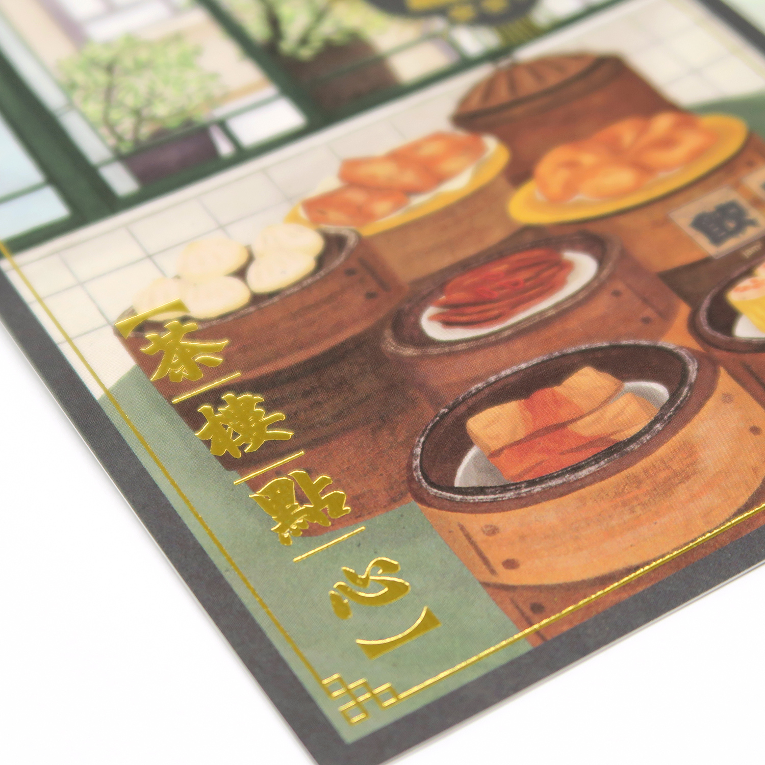 這款明信片特別採用燙金印刷及厚實的紙張增加質感,將帶您體驗香港茶樓文化的獨特魅力,感受熱鬧和繁華的氛圍。