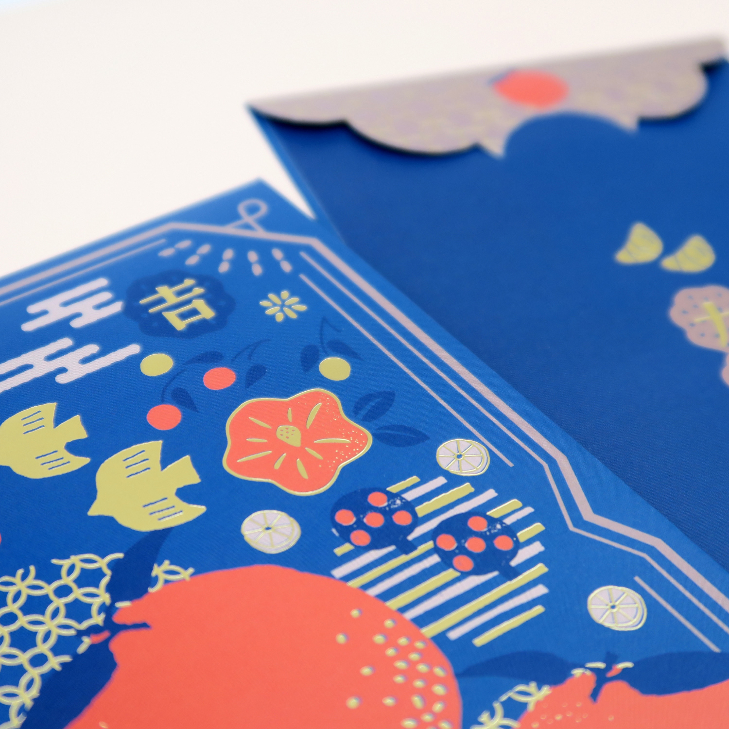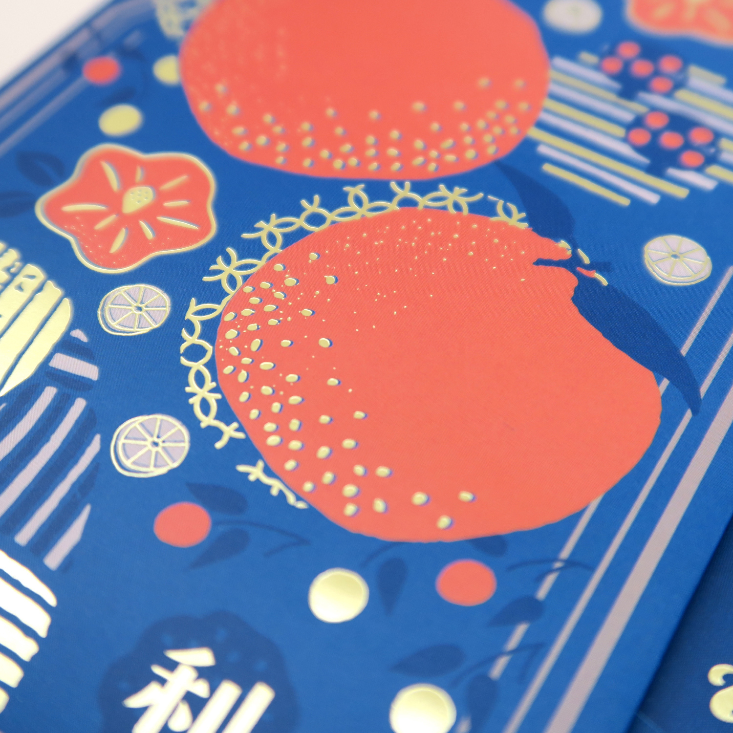 這款紅包設計融合了桔果和農田等元素,以藍色為主色調,寓意著吉祥和繁榮。