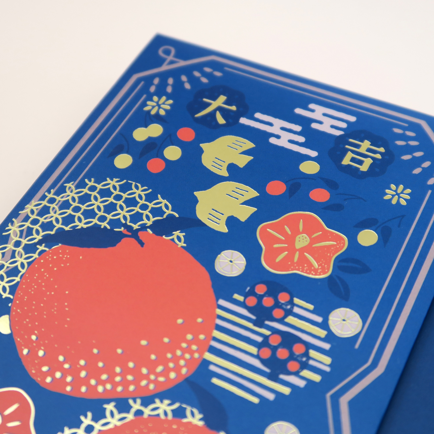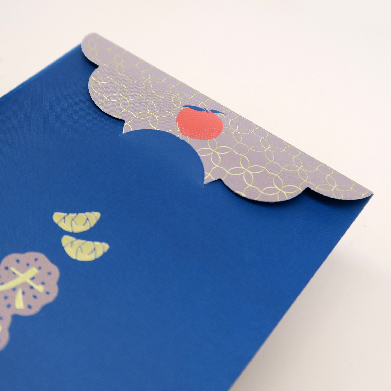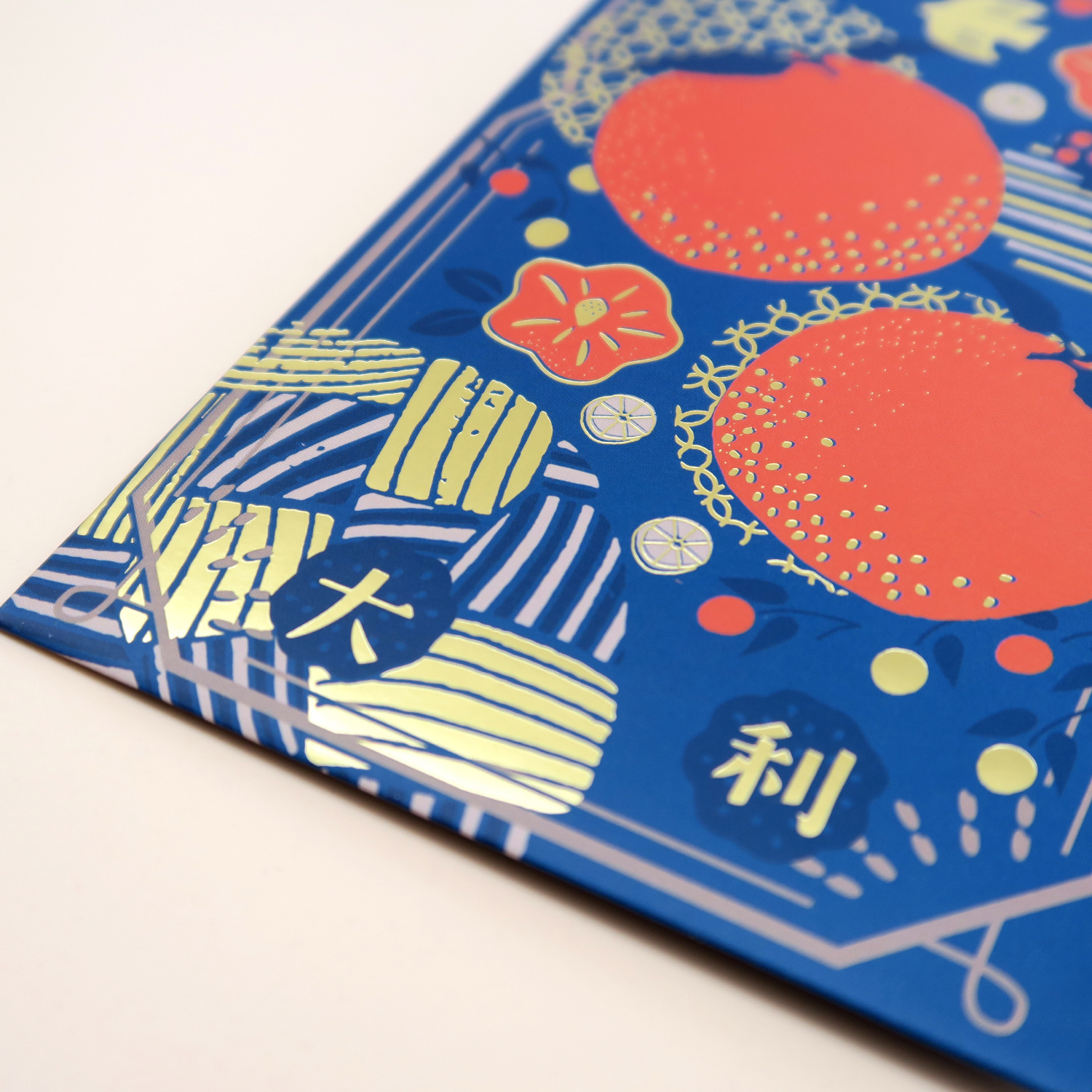 桔果和農田的圖案象徵著收穫和豐盛,希望為大家帶來好運和財富。深邃的藍色為整體設計增添了高雅的品味和穩重感。